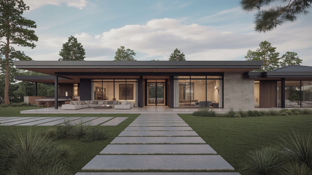Modern ranch houses combine classic single-story layouts with contemporary features like open floor plans and large windows. Updated materials such as metal roofing, glass panels, and mixed exteriors give them a current look.